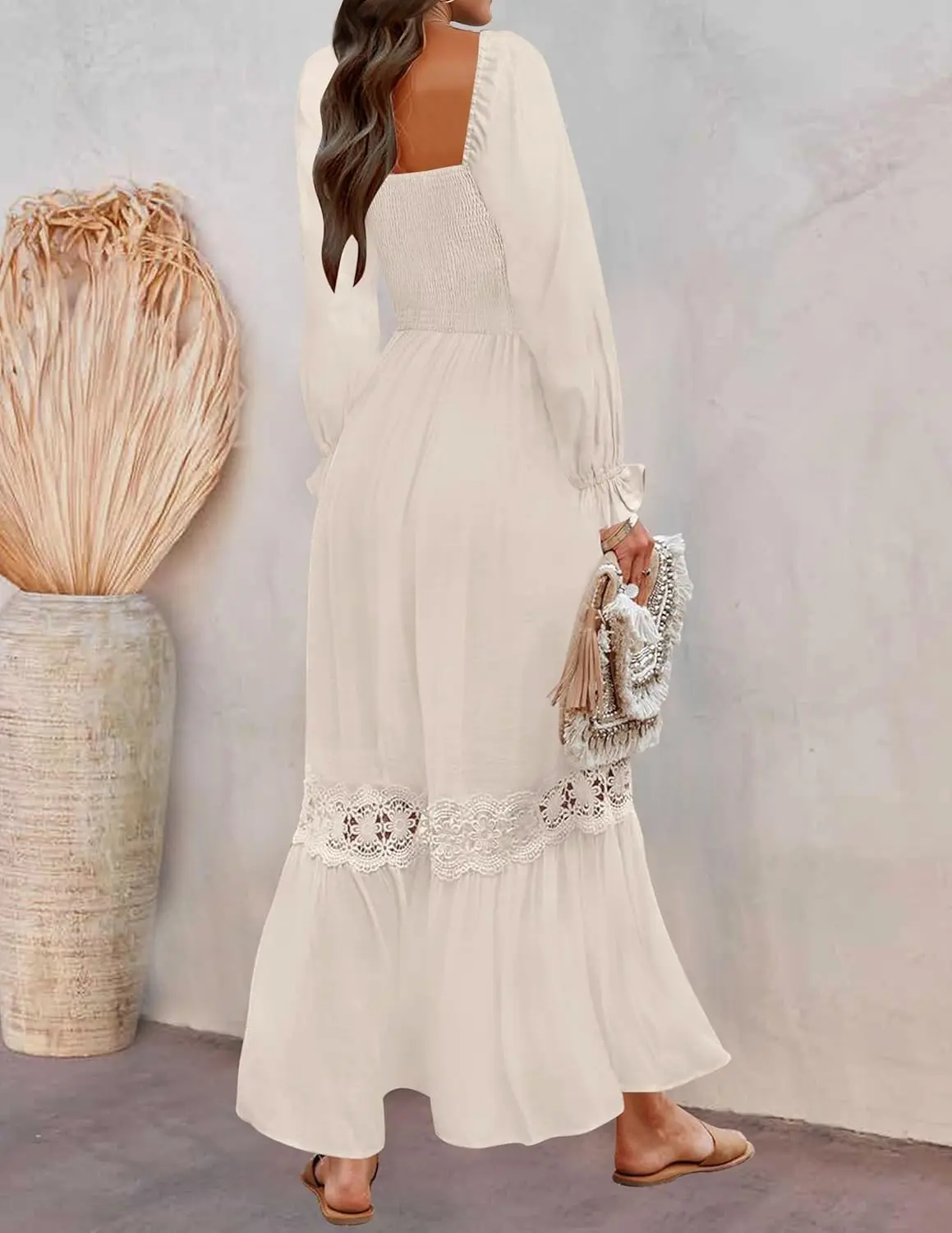 Women's Boho Chic Maxi Dress Long Sleeve Square Neck Empire Waist Flowy Casual Summer Solid Woven Chiffon Front Lace Anti-Static